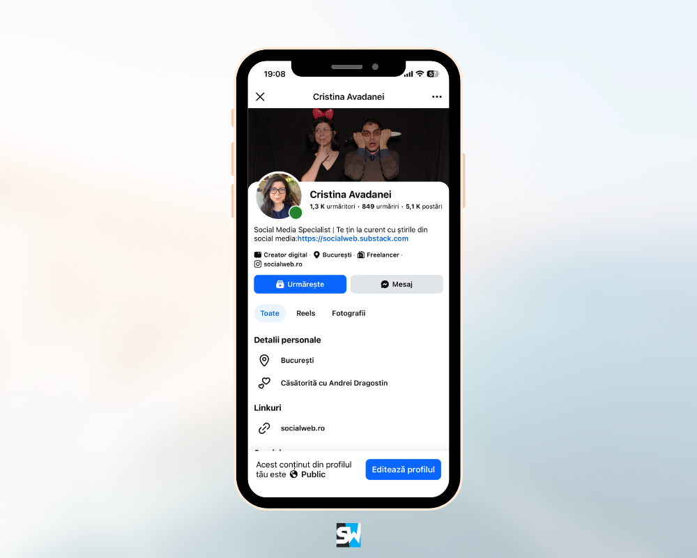 Apoi ai detalii personale, link-uri, job, studii. Din nou, depinde ce ai setat să afișeze.